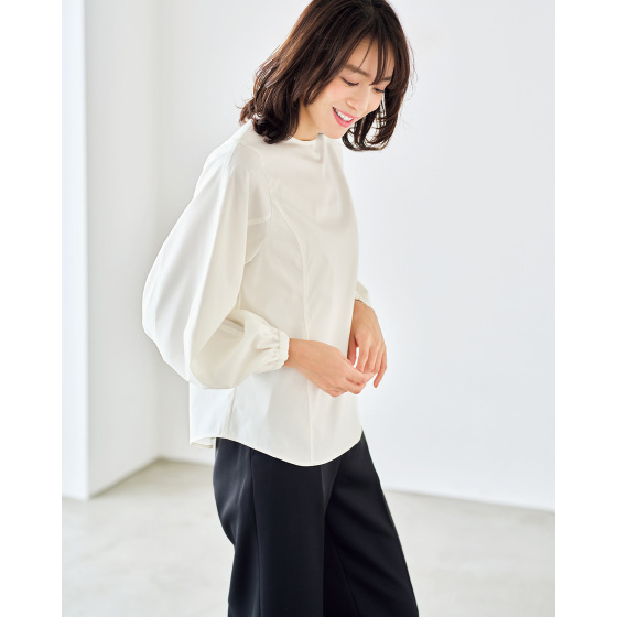 ブラウスは袖口ゴムでふんわり。袖ボリュームのアレンジも簡単。パンツはシャープなワイドストレートとハイウエストで脚長見せ。※通年着用できます。
