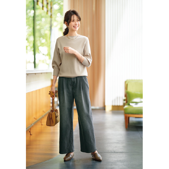 ゆるっとはけて脚線の悩みをカバー。コーデが大人に決まるワイドストレートのデニムです。雨の多い春に常備しておきたい、はっ水加工の1本。※通年着用できます。