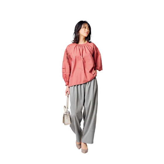 タック効果でお腹をカバーしながら、腰回りゆったり。裾に向かってゆるくカーブする旬シルエットです。さらっとしたウール調の上品生地が、きちんと感で大人映え。※通年着用できます。