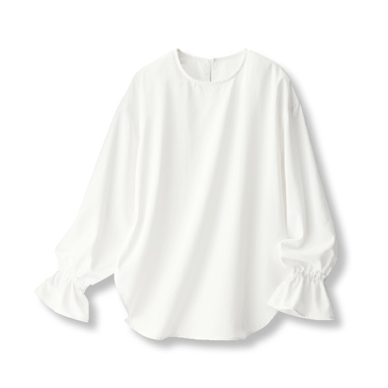 見た目も肌触りもまるでコットン。なのに多機能でお手入れがラクなブラウスです。シンプルで着回しやすく、袖口だけに出る華やぎで大人に上品な着映え感。