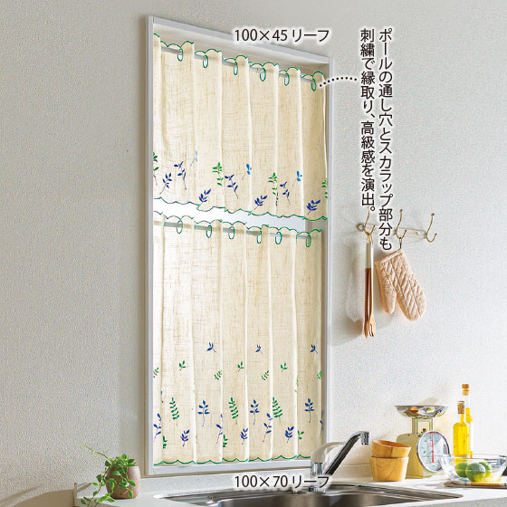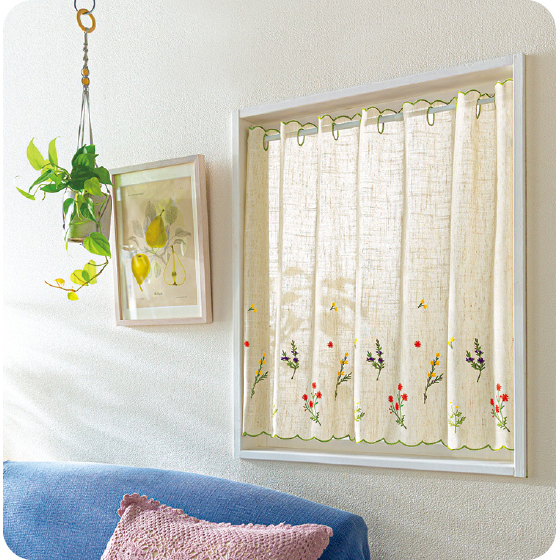 ナチュラルな麻混生地に可憐な草花を刺繍。ポールの通し穴とスカラップ部分も刺繍で縁取り、高級感を演出。