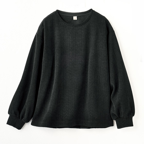 表面感のあるジャカード素材。おしゃれをアシストする上品な柄が大人な印象。体のラインを拾いにくいゆったりシルエットです。