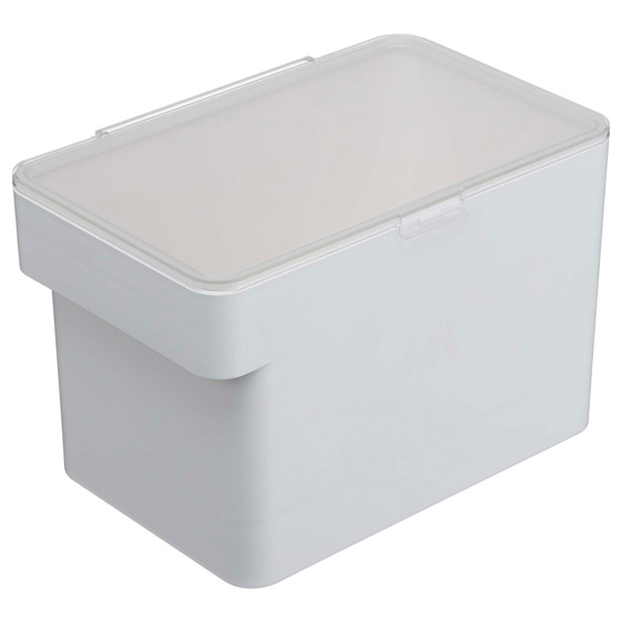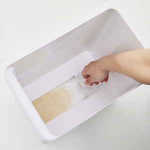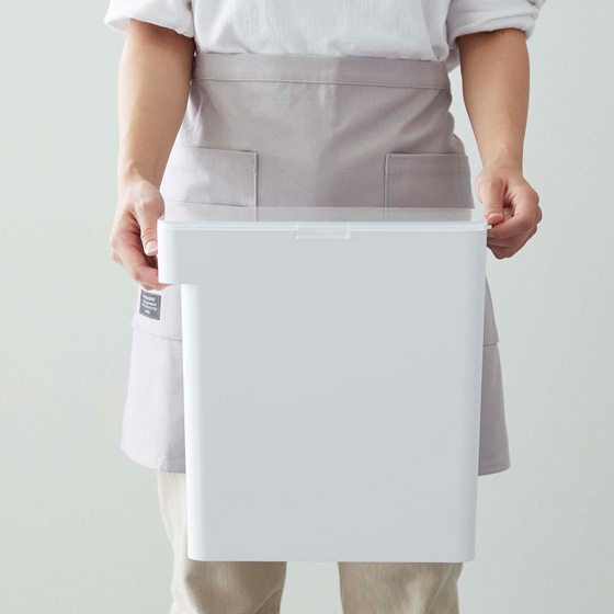 蓋は全面が開くからお米がすくいやすく、残量が分かりやすい透明蓋。底の形が付属の計量カップにピッタリとフィットするので、残りのお米をきれいにすくい取れます。持ち手があるからお米の補充の際の移動も簡単!部品は全て分解して洗えるので、いつでも清潔に保てます。すり切り一杯で1合、段差部分で半合が測れる段々米計量カップ付き。