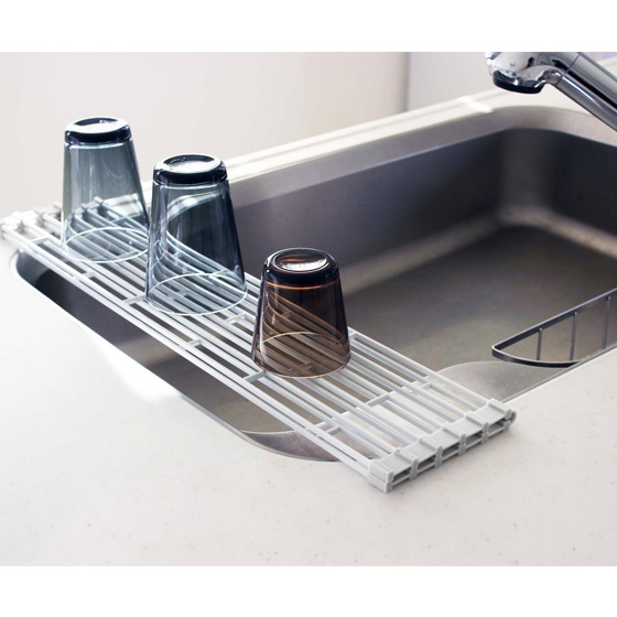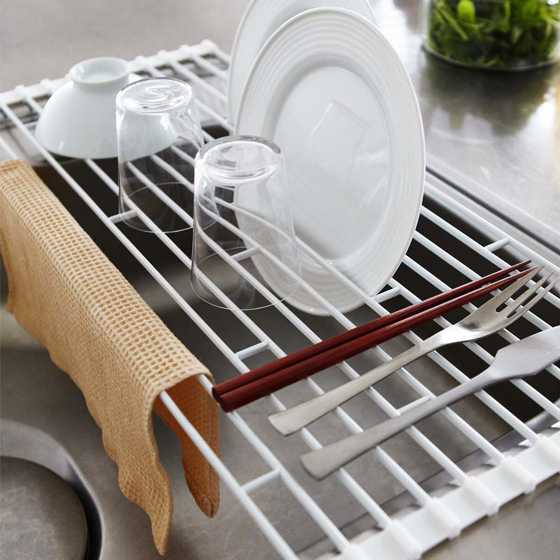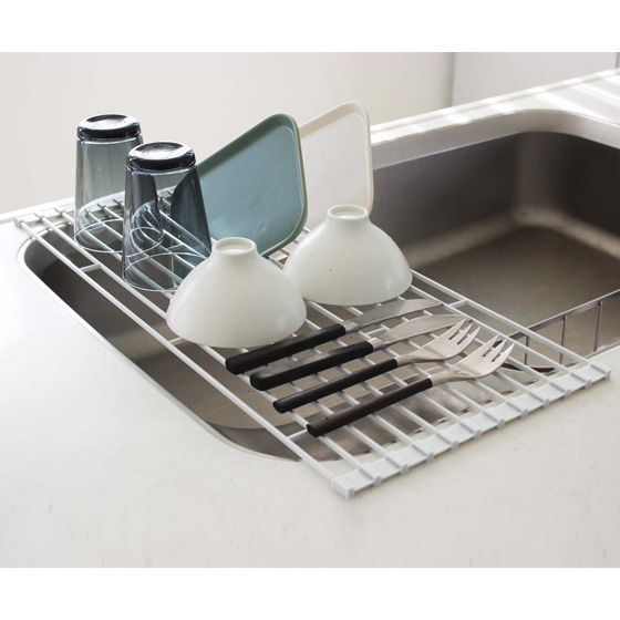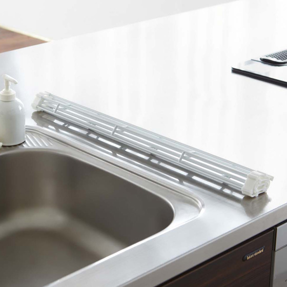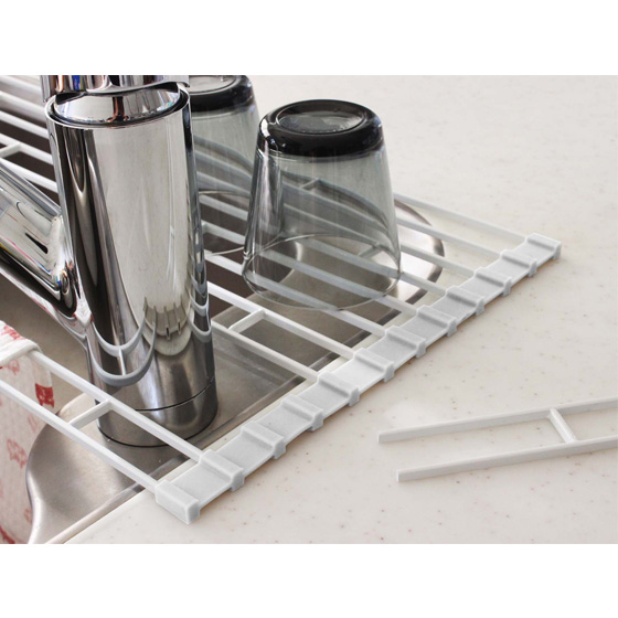 ふきんを干したり、小皿を立てて乾かすことができる水切りラック。調理台の延長として使ったり、料理の盛り付け場としても活用できます。量が少ない時には、使いたい幅にたたんで水切りが可能。キャップとワイヤーが取り外せるので、水道蛇口を避けて設置することもできます。使わない時はクルッと巻いて収納できるので、場所を取らずに便利です。