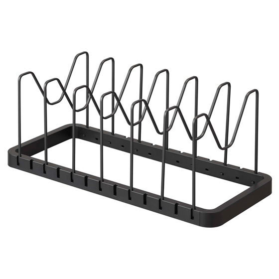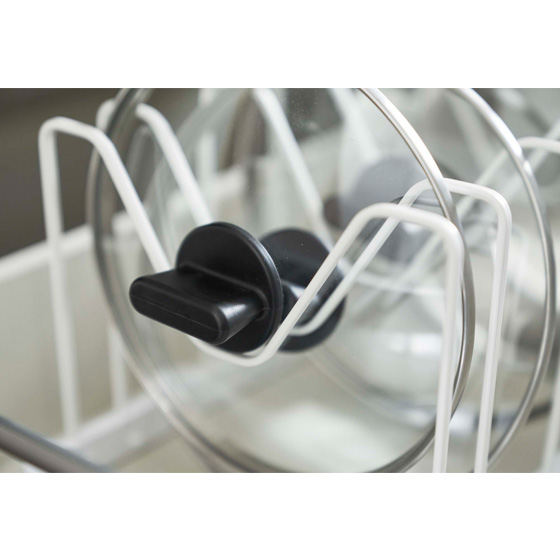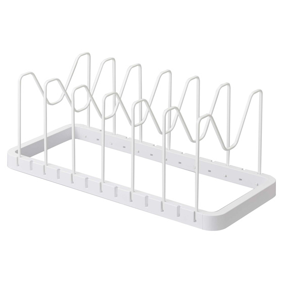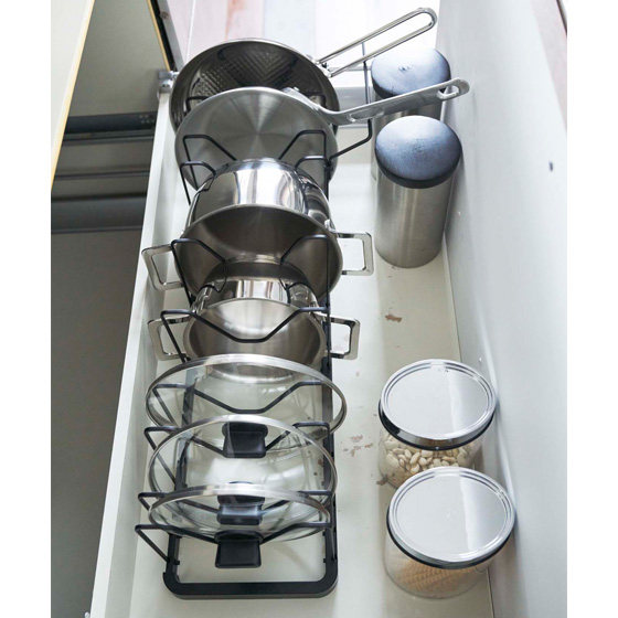 鍋やフライパンのサイズに合わせて仕切りパーツの位置を3cmごとに調整可能。持ち手が上になる設計で取り出しやすく、下に空いたスペースで収納力もアップ。キッチンの整理整頓に最適なアイテムです。