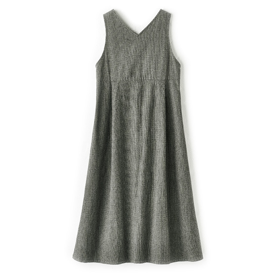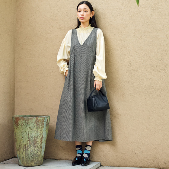 インナーを重ねてもモタつきにくいVネックで、重ね着しやすい仕様に。胸下からの切替シルエットで脚が長く見える効果も。