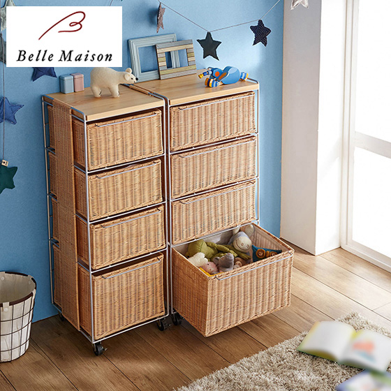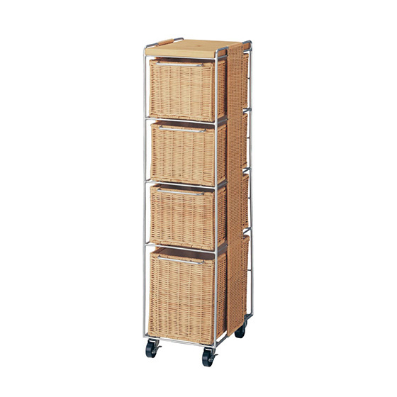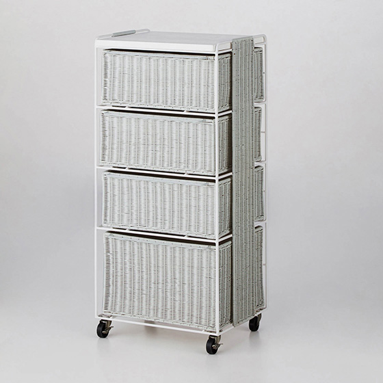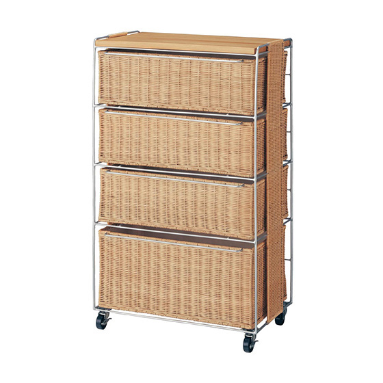 スチールフレームを組み合わせることで、軽やかな見た目と丈夫さを両立しました。キャスター付きで移動もラク。引き出しは通気性が良く、内布付きなのでタオルや衣類の収納にぴったり。側面にも贅沢にラタンを編みこみ、インテリア性をアップ。