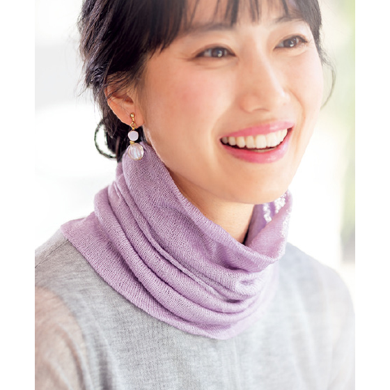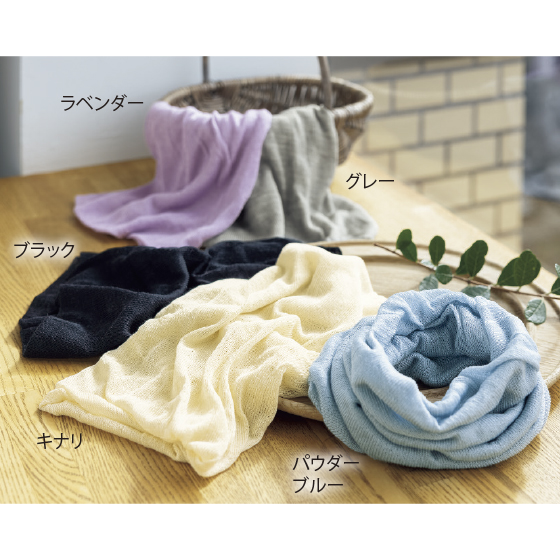 老舗メーカーがつくり上げたシルク素材の日本製生地。紫外線は遮りながらも風を通す薄さで快適に着用できます。ねじりを加えた編み方でできるドレープが首元に表情を演出。気になる首元の冷房対策にも。