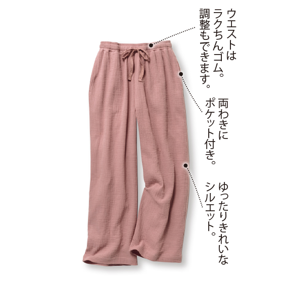 2重ガーゼでふわり、くしゅっとした表面で肌さらり。ゆるりとくつろげるシルエットに仕立てました。