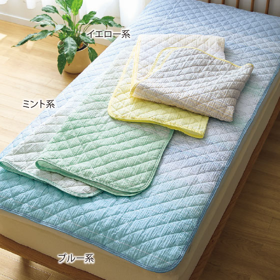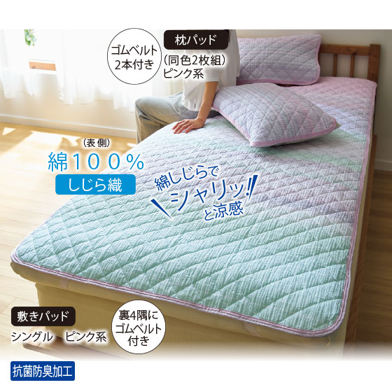 ●裏4隅にズレ防止のゴムベルト付き(敷きパッド)、ゴムベルト2本付き(枕パッド)