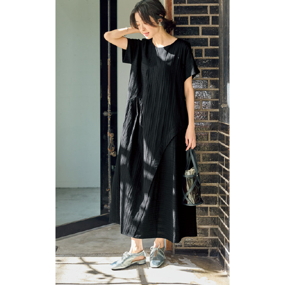曲線の切替や、不揃い幅のタック使い。遊び心が夏らしいジャカード生地のワンピース。体形を拾いにくいゆったりシルエット。