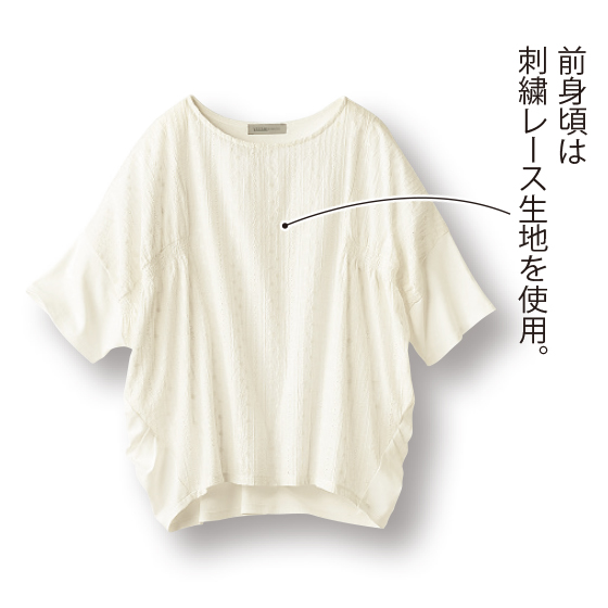前は刺繍レース、後ろは美カットソー。ハイブリッドな素材使いと、鮮やかな切替テクに、ボヤージュらしいモード感。※カットソー部分はオーガニックコットン混。