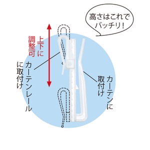 付属のアジャスターフックはAフック(レールが見えるタイプ)になります。アジャスターフックで裾の位置が調節できます。5o間隔でスライドし、カーテンの高さを1p低くしたり、または4p高くすることができます。