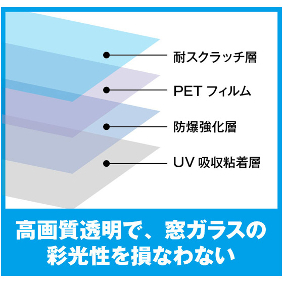 防犯性能の高い建物部品につけられる日本製CPマーク適合品の防犯フィルム。貼るだけで窓ガラスを割れにくくし、ガラス破りからの侵入を防ぎます。強固な4層フィルム構造で、厚み0.45mm。