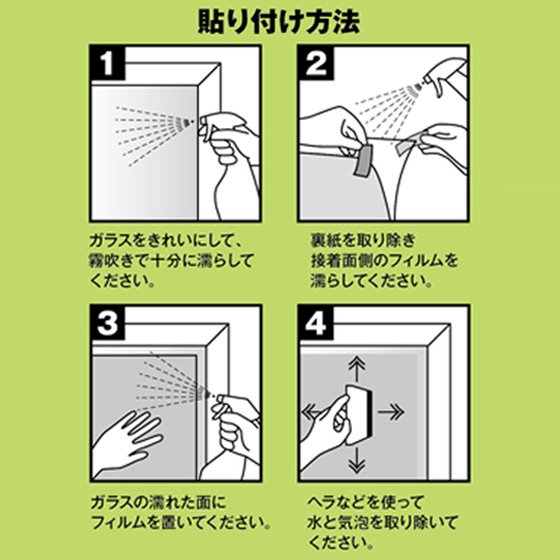 ※型板ガラスなど表面に凹凸のあるガラスには貼れません。