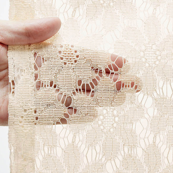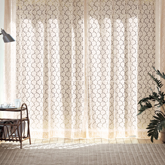 淡いクリーム色と白の2色の糸を使って濃淡を出した複雑な織り方のレース地で、綿のような風合いとキナリ色がナチュラルな雰囲気に。光が当たると、床に花の形の影がおちて、窓辺を柔らかに演出してくれる、上品なレースカーテンです。日光の当たる時間も当たらない時間も、お部屋を品よくエレガントな表情で楽しませてくれます。