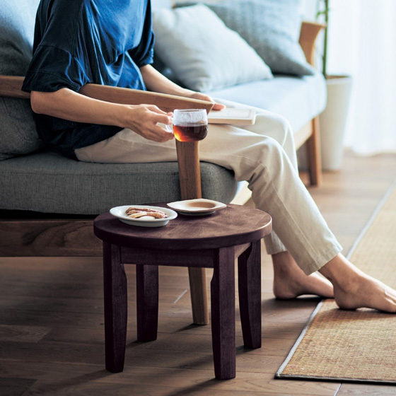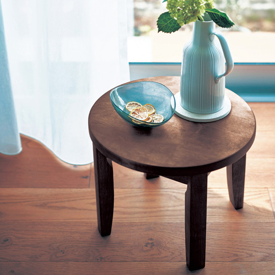 リビングで邪魔にならないミニサイズ。この小ささが使いやすい。今の暮らしになじむちゃぶ台。床に座って、ちょっと寛ぐときにちょうどいい高さです。窓辺や玄関で花台として使っても素敵。ムラのある色や風合いで、昔っぽさを再現しました。