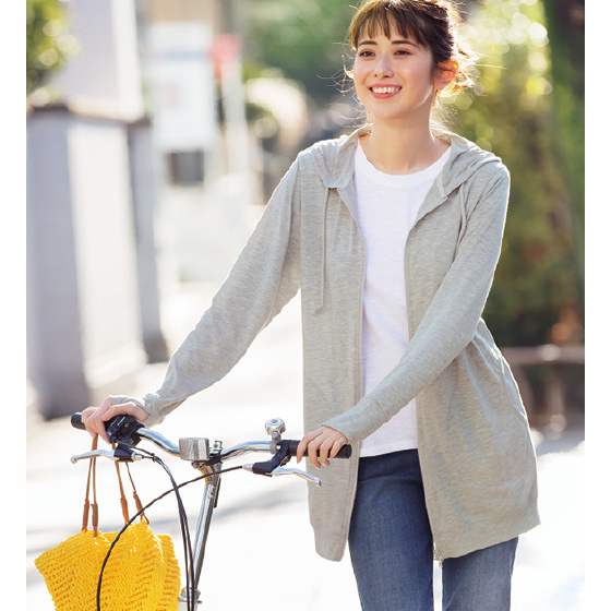 薄手でさらっと軽やかなUVカット素材。冷房などで寒さを感じるときにも便利。