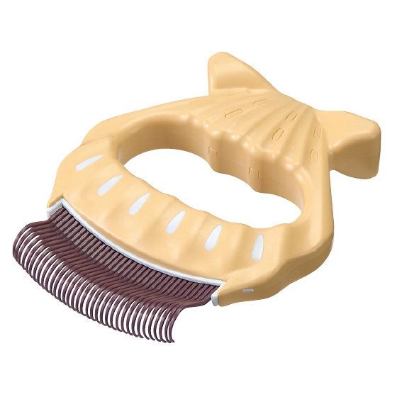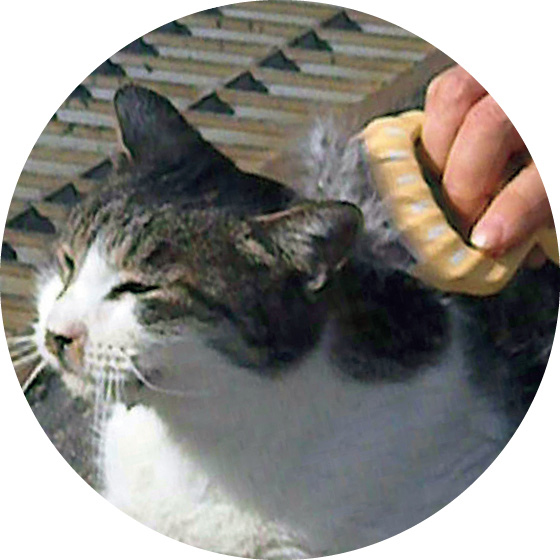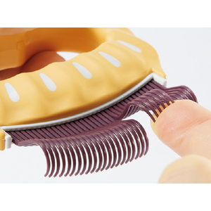 手ぐしからひらめいた、ペットにやさしいケアブラシです。くし歯がやわらかくしなるので毛をピッと引っ張ったり、肌を痛める心配が少なくなります。力を入れずに軽くすくだけで抜け毛がごっそり取れます。抜け毛はくし歯のふところ部分にたまるので飛び散らず、後始末も簡単です。