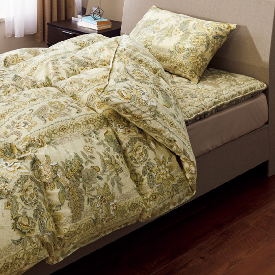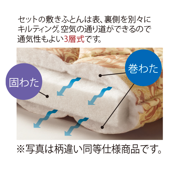 ※ふとん(特に敷きふとん)は使用状況によって、程度の差はありますが、必ずヘタリ(ボリューム感や弾力性がだんだんなくなる状態)が商品の特性上発生します。ご了承ください。※寝具商品は、生地幅の関係上ハギ(つぎ目)が入ることがございます。また裁断の都合により柄の出方が多少異なりますので、あらかじめご了承ください。