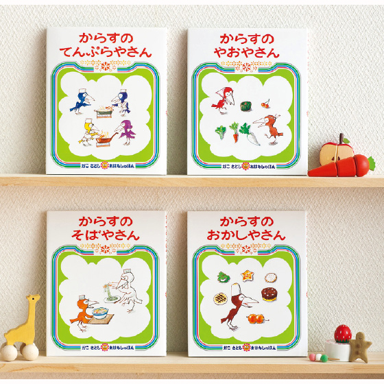 ●1973年9月発売(からすのパンやさん)、2013年4月発売(からすのおかしやさん、からすのやおやさん)、2013年5月発売(からすのてんぷらやさん、からすのそばやさん)
