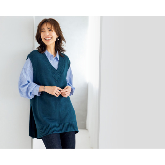着ぶくれしにくく、すっきり決まる。重ね着しやすいベスト。