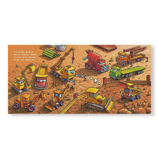今日から大きなビルを作る新しい工事が始まります。「ぼくたちだけで、できるのかな」。そこで、ミキサー車がクラクションを大きく鳴らすと、さらに5台の働く車たちがやってきました…。子どもが大好きな車絵本。