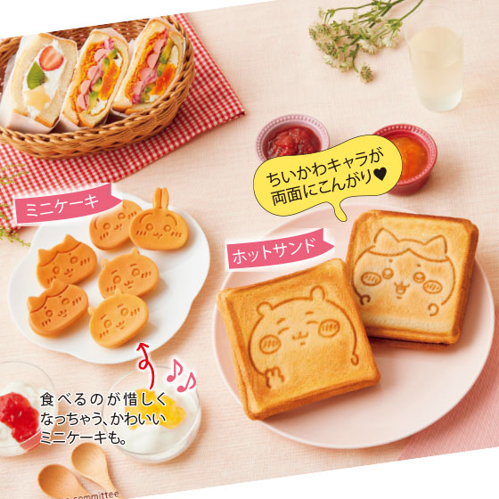 漫画「ちいかわ」の仲間たちが、こんがりホットサンドに!タイマー付きだから、忙しい朝食にもおすすめです。6〜8枚切りの食パンに対応。プレートは外して丸洗いができます。