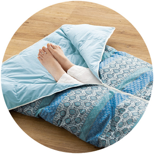 ふだんはクッションや肌掛けふとんとして、避難時には寝袋として。備えておけば安心です。