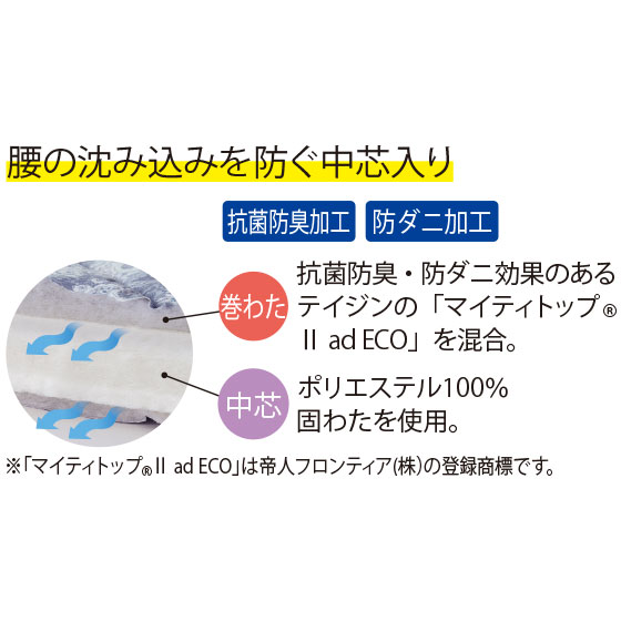 巻わたには抗菌防臭・防ダニ効果のあるテイジンの「マイティトップ(R)2 ad ECO」を混合。中芯にはポリエステル100%固わたを使用。