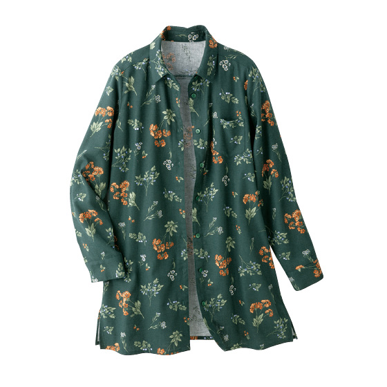 なめらかで温もりのある綿麻の起毛素材に、シックな色合いの上品な花柄をプリント。きちんと感のある衿付き。ボタンを開けて抜け感を出してもおしゃれ。ヒップが隠れるチュニック丈で体形カバー。