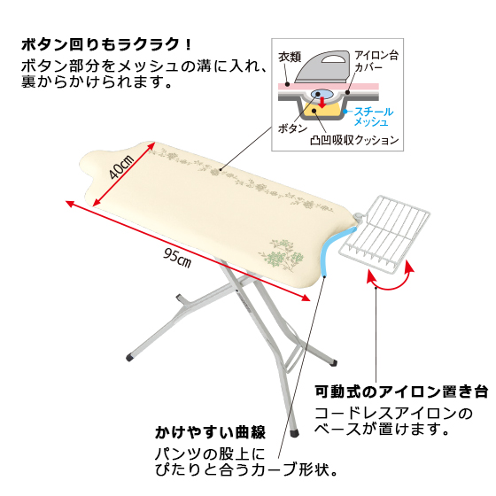 ●サイズ:幅95(アイロン置き台含まず)×奥40×高27〜81cm(計15段階調節)、アイロン置き台=幅33.5×奥18.5×高4cm、替カバー=幅95×奥40×厚0.3cm