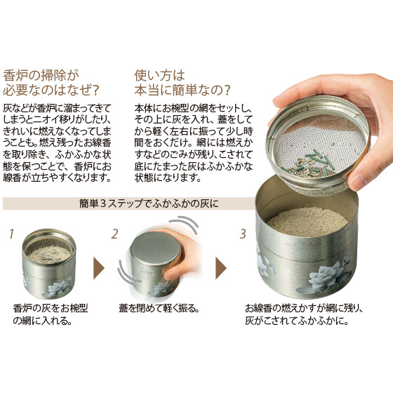 灰などが香炉に溜まってきてしまうとニオイ移りがしたり、きれいに燃えなくなってしまうことも。燃え残ったお線香を取り除き、ふかふかな状態を保つことで、香炉にお線香が立ちやすくなります。本体にお椀型の網をセットし、その上に灰を入れ、蓋をしてから軽く左右に振って少し時間をおくだけ。網には燃えかすなどのごみが残り、こされて底にたまった灰はふかふかな状態になります。