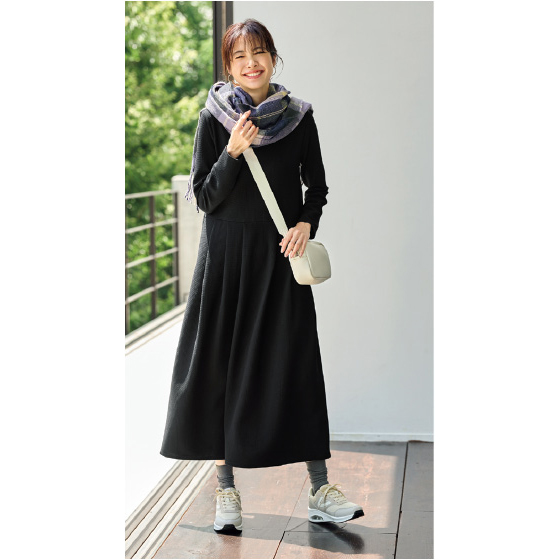 360度よく伸びる上品生地。洗濯機で丸洗いできて乾きが速く、シワや毛玉にもなりにくいから、イージーケアでがんがん着回せます。スウェットみたいにラクな着心地なのに、落ち感ドレープで美シルエットに。すとんと1枚着るだけで体形カバーも叶います。