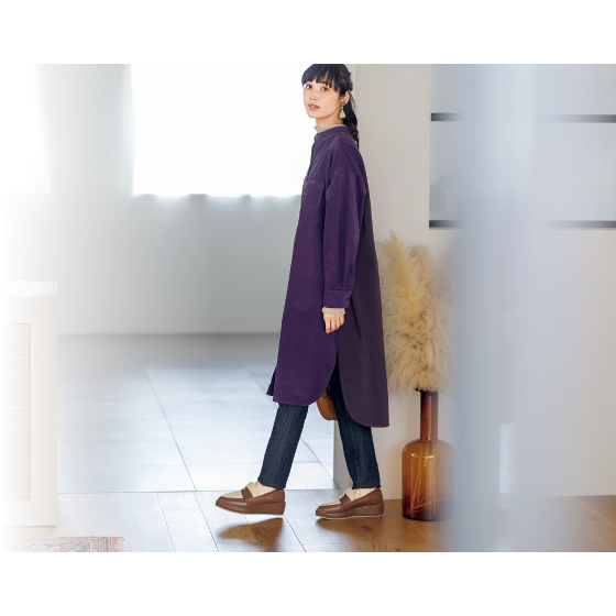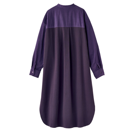 生地にカポック繊維を使用し、軽くてやわらかなコーデュロイに。すっきり見えるシルエットで、後ろ身頃はカットソー切替で軽やかな着心地です。