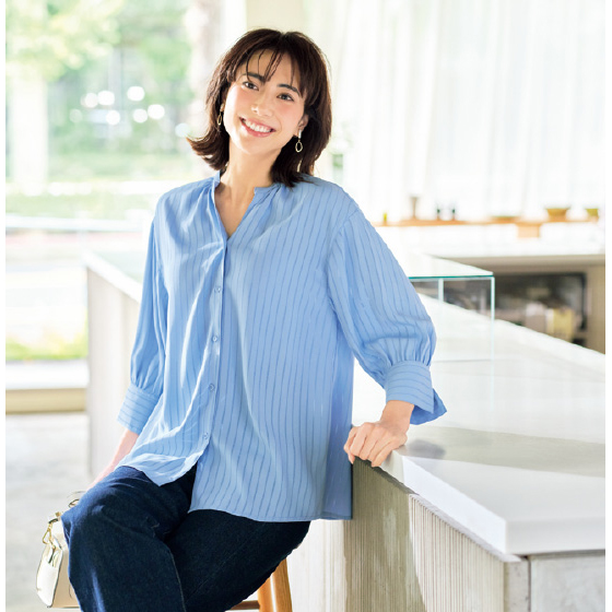 ドレープ感が美しいバックサテンのブラウス。ストライプ状のドビー織が上品で、流れ落ちるギャザーもエレガントです。二の腕カバーが叶う7分袖で。