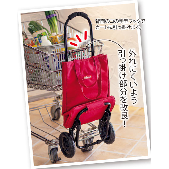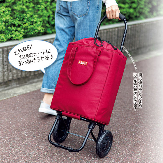 お出かけの必需品・キャリーカートですが、お買い物中の扱いに困ることも。スーパーのカートに引っ掛けられて邪魔にならない、その名も“かかーる”でラクしましょう。帰り道はコロコロ引くだけで楽ちん、大きめのタイヤで段差もスムーズです。たっぷりサイズで、毎日の買い出しに重宝します。