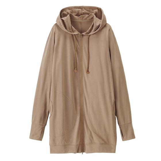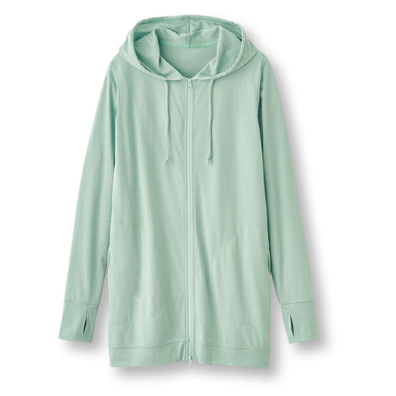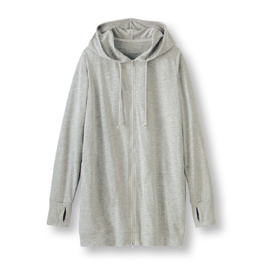 サラリと軽い薄手で、暑い季節に活躍パーカー。二の腕、ヒップ、手の甲までカバーして、フードをかぶれば首の日焼け対策にも。下からも開くWジップ仕様。