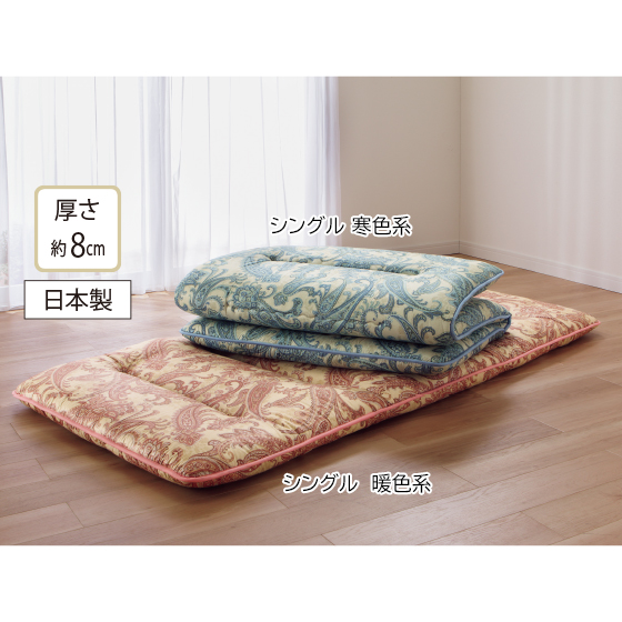 ※ふとん(特に敷きふとん)は使用状況によって、程度の差はありますが、必ずヘタリ(ボリューム感や弾力性がだんだんなくなる状態)が商品の特性上発生します。ご了承ください。※寝具商品は、生地幅の関係上ハギ(つぎ目)が入ることがございます。また裁断の都合により柄の出方が多少異なりますので、あらかじめご了承ください。