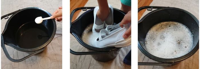 Aぬるま湯10Lに対して20g(付属の計量スプーン山盛り1杯)の割合でオレンジングパワー(R)ズック用洗剤をバケツに投入してかき混ぜ、これに上履き2足分を漬け込んでいきます。