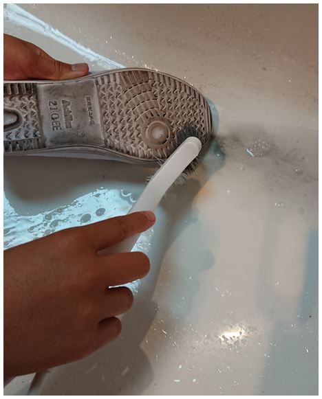 B漬け込んでから4時間後(通常は2時間程度、汚れがひどい場合は少し長め)、上履きを引き上げてブラシで洗います。