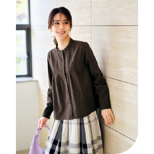 ニット重ねも決まる、バンドカラーのふんわりブラウス。