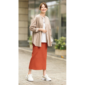 シンプルなトップス合わせでも、柄スカートでコーデが決まる。