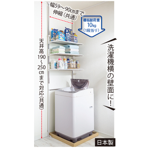 天井つっぱり式で、洗濯機上や横のデッドスペースを収納に。