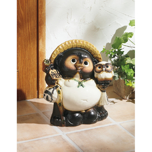 縁起のよい狸とふくろうが、仲よくお出迎え。