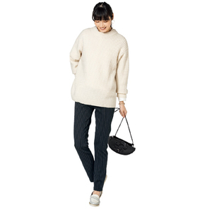 体の線を拾いにくい、マシュマロミラノリブ。ネックがきれいに立ち上がり、袖口キュッとやさしげ。