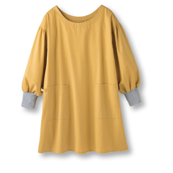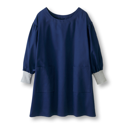 ゆったりサイズでサッとかぶれ、すぐ家事モードになれます。腕まくり簡単!リブ仕様の袖口。フックなどに掛けられるループ付き。スマホも入る右ポケットにはタオル掛けも。