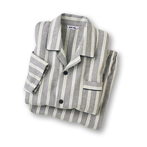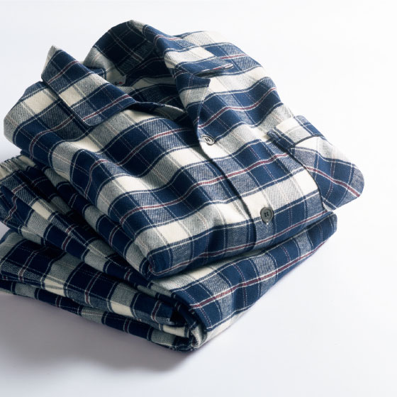 空気を含んで温もりを保つ中空糸を、織物の名産地・播州で織り上げたふんわりソフトなツイル起毛のパジャマです。椿オイル配合で風合いも心地よく、しっとり。