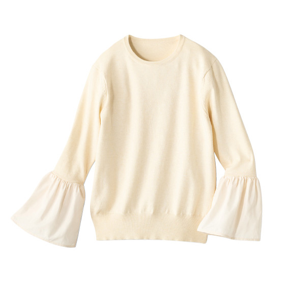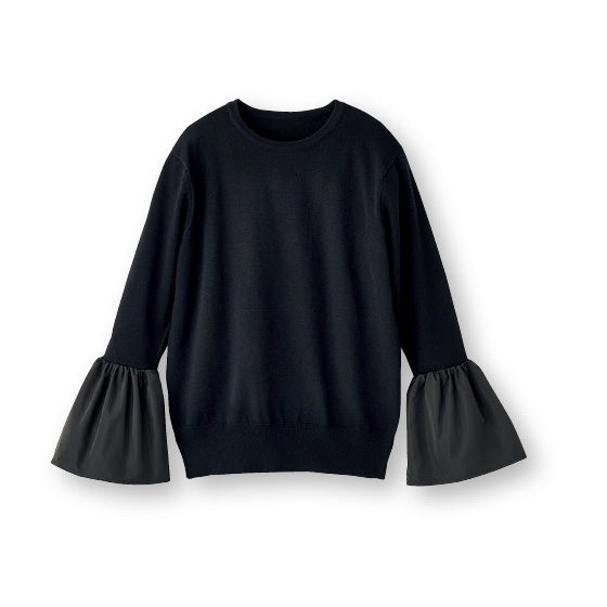 身頃と袖はニット。袖口を異素材で切替えて、フレアで華やかさをプラスしました。