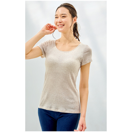 細番手のオーガニックコットン糸で編んだ、やわらかな風合い。色も自然な杢調に。